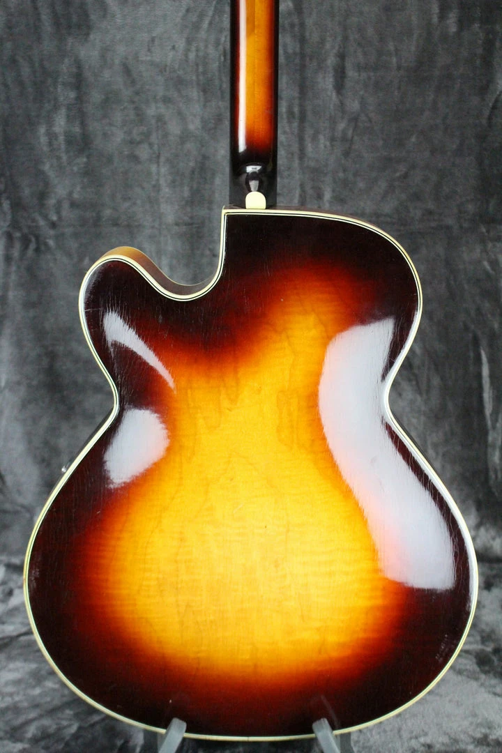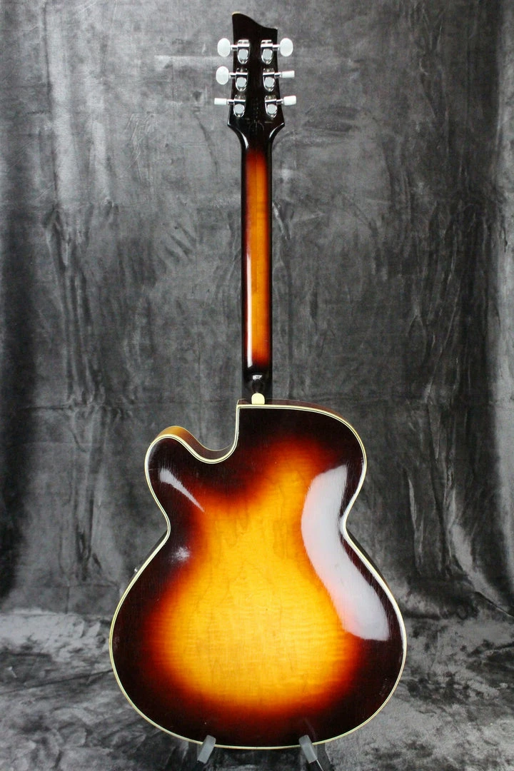 Summary: The Grand Star was the flagship model of Framus in the 1950’s. The pickups and electrics work perfectly. It has a massive spruce top which gives this guitar a very nice vintage jazz tone. This guitar features unique mother of pearl inlays, has low action, and comes strung with flat wound strings. It has good sustain and a resonant tone.