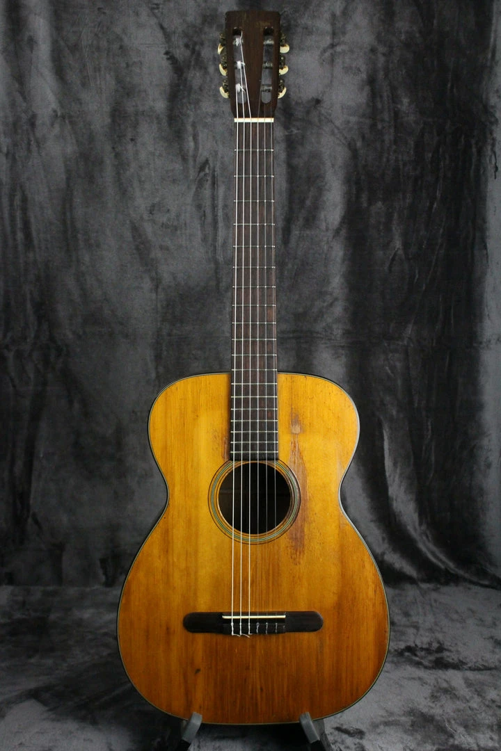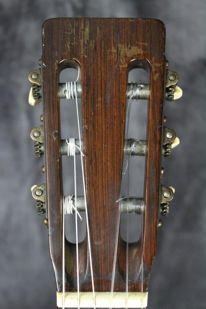Summary: This is Martin’s version of a modern Nylon-string guitar, and it is delightful. These models have many of the 00-18 style earmarks and appointments in common with 00-18 steel string guitars of the same period, with a couple of exceptions. The Nylon string models have matching 14 fret body “shapes,” but their necks join the body at the 12th fret. Additionally, except for some of their early examples dating from the mid-1930’s, Martin chose to use a “fan” bracing pattern that was also “scalloped” on these G models, and they also have a 2-inch nut width and loop string bridges. Like their steel string brethren from the same period, these feature Mahogany neck and body construction, Spruce tops and Rosewood fingerboards with matching “loop” style bridges.