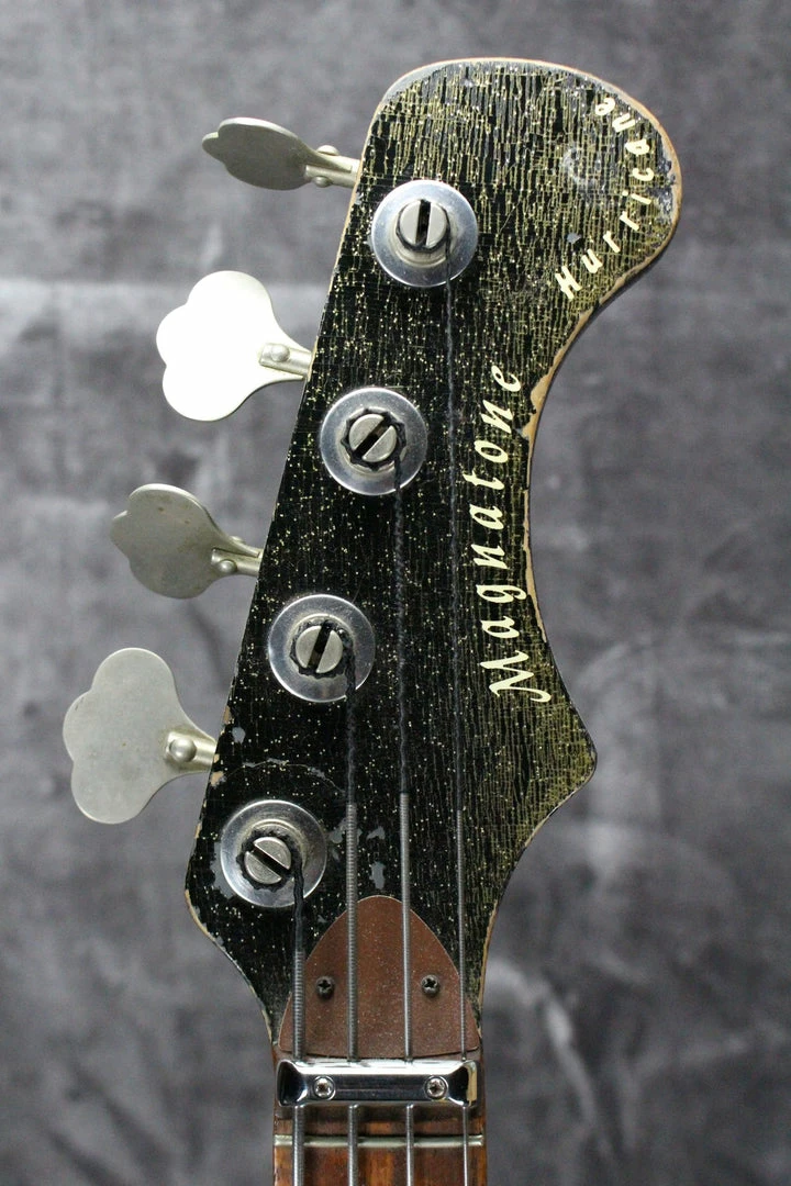 Summary: This is a great sounding and rare Magnatone Hurricane bass with a phenomenal pickup and great feel. Everything about this bass from the body shape and size to the neck shape makes it super comfortable to play. The pickup sounds great. The roller wheel for the mute is not functioning but everything else is working properly. There are various scratches, nicks, dings, dents and small chips throughout the bass along with consistent weather checking and some areas of buckle rash worn through to the bare wood on the back. The fingerboard and frets are in great shape with only light play wear and tons of life left in them. The neck is super comfortable with great action.