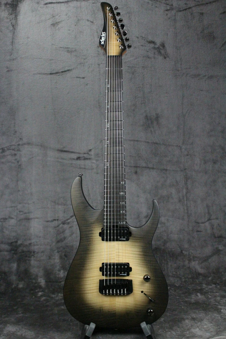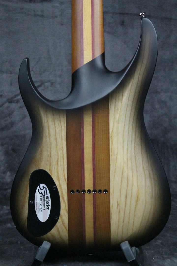 Pickups/Hardware: Black Chrome hardware, Schecter locking tuning keys, Lundgren M7 pickups, one volume knob/ one tone knob with push/pull option, 3-way pickup selector, Hipshot Ibby HM Guitar Bridge.