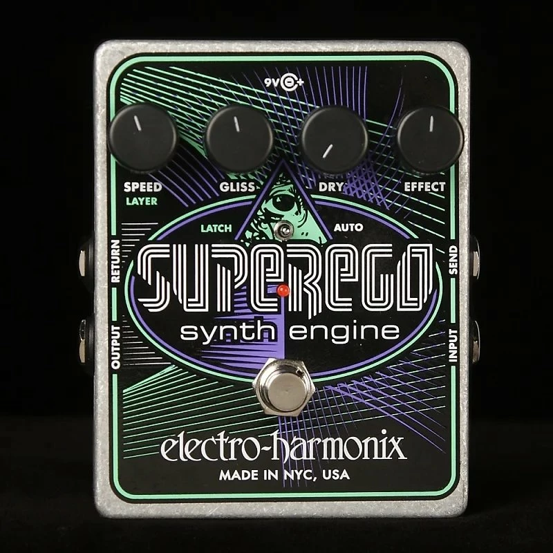 The Electro-Harmonix Superego Synth Engine effects pedal is a new and unique product that combines elements of sampling, synthesis and infinite sustain. The Superego allows you to freeze sound, gliss between frozen tones, layer sounds and place an external effects loop on only the effect. In addition, the Superego can detect new notes or chords and sustain them automatically without requiring you to step on the footswitch. It even lets you tweak attack and decay, or use its effects loop to invent novel synth patches.
