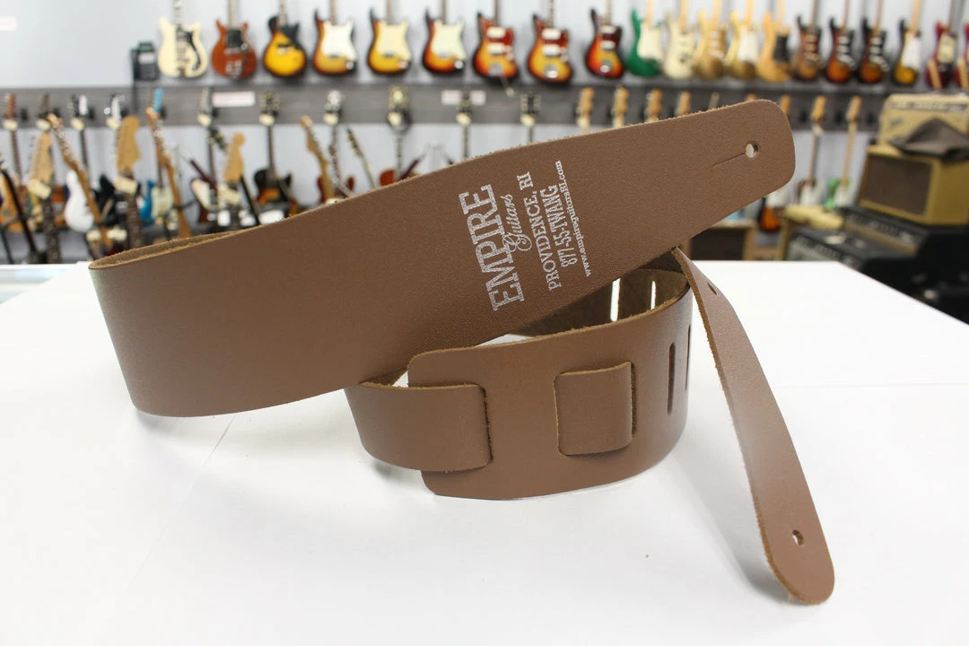 This is a Henry Heller guitar strap. It is brown leather with no stitching. It has the Empire Guitars logo.