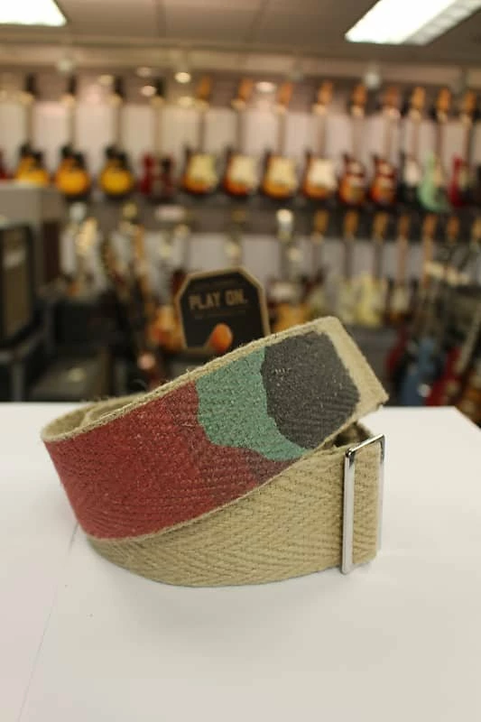 - Levy’s 2″ hemp ‘vegan’ guitar strap with printed sunset design on natural hemp webbing with 2-ply cork ends.