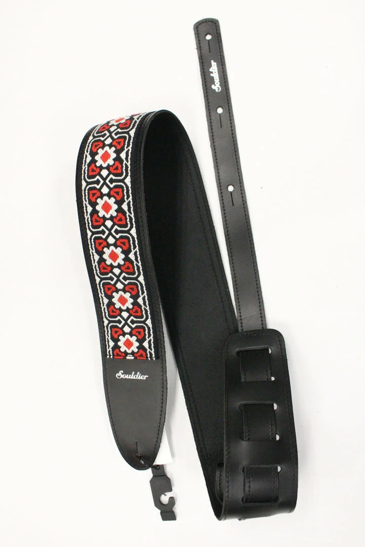 This is a 2.5″ wide leather Souldier Torpedo Fillmore Red, Black, & White guitar strap.