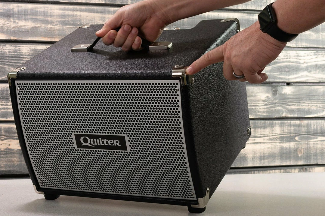 Can a bass cube hardly bigger than a breadbox deliver fully professional stage volume? You bet, when it combines a long-throw 10โ speaker, pro-audio cabinet construction, high-flow bass port, HF horn, and Quilterโs exclusive BassDockTM mounting system. Our highly acclaimed 800W Bass Block amp provides extra headroom to get the most from this compact cab. Makes a great grab-and-go compact combo, or set the rig on top of another 10 or 12-inch BassDock cab for twice the output. 10-inch, 400-watt custom-built Eminence speaker delivers plenty of punch without neglecting the bottom octave. The rear-firing bass port provides ample reinforcement of the lowest octave without โchuffingโ through the aluminum grille. The front mounted speaker and โunibodyโ solid-core plywood construction provides maximum strength without excess weight. The modular BlockDock system lets you easily remove your Bass Block for fly dates or mount it in the cabinet of your choice.