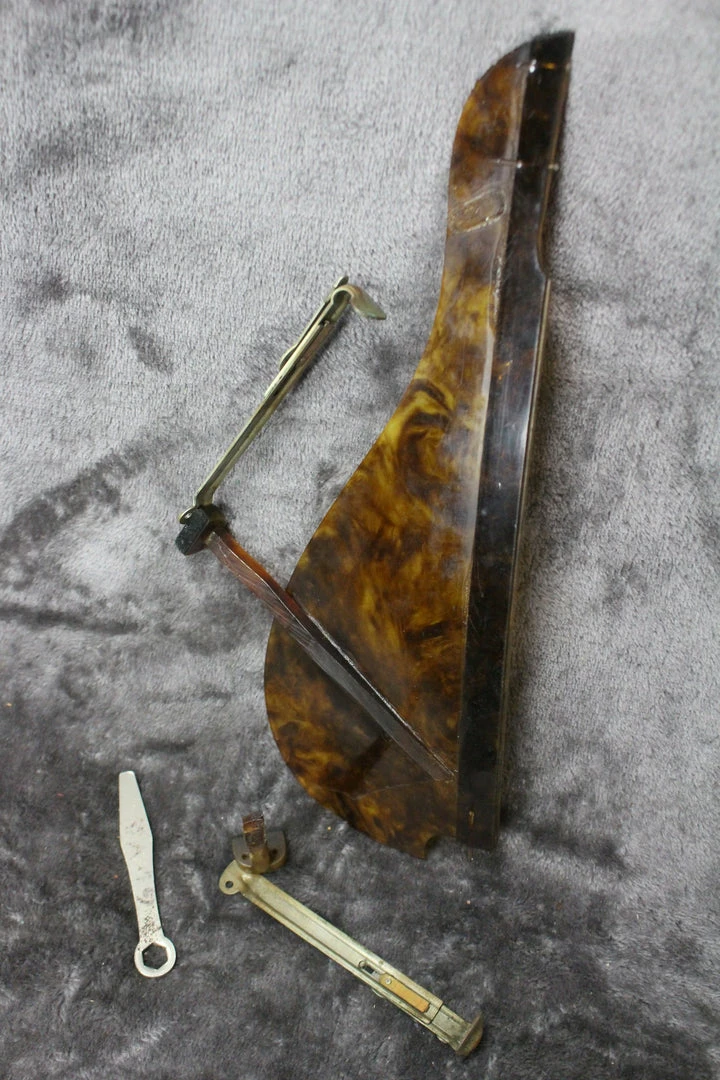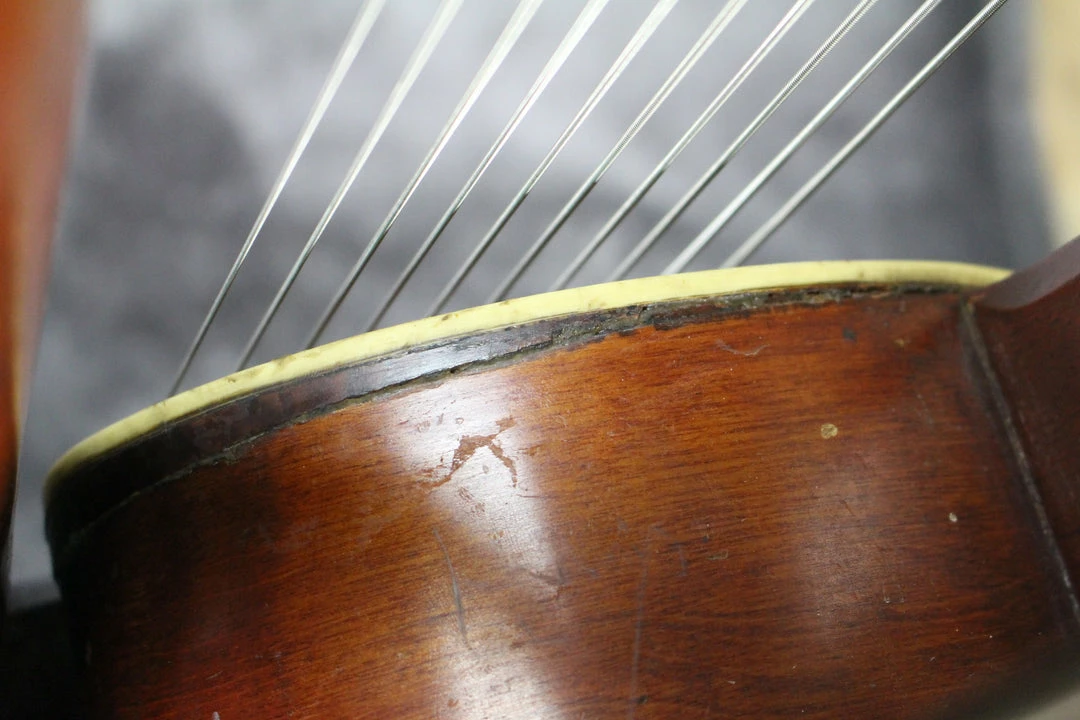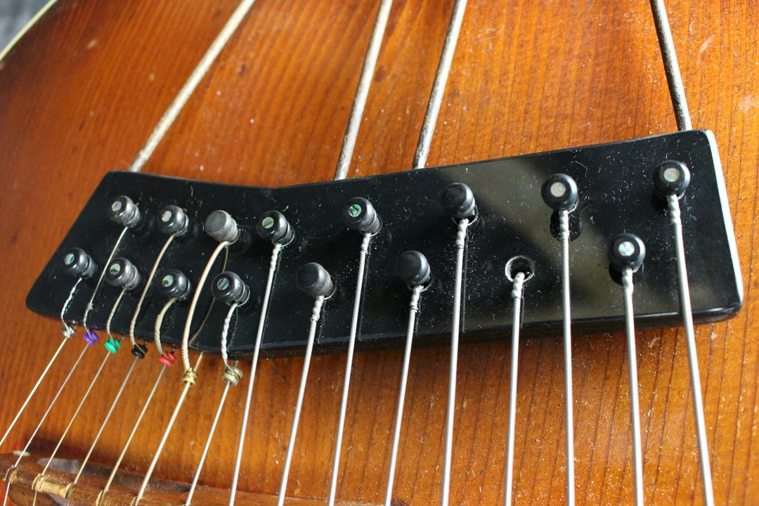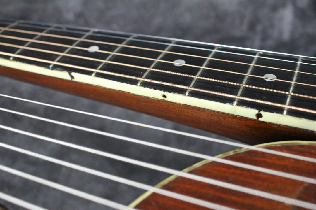 Modifications: A new plastic tailpiece was crafted. On the bass side of the six-string part of the instrument, someone has inexpertly replaced the binding from the 13th fret to the 19th fret.