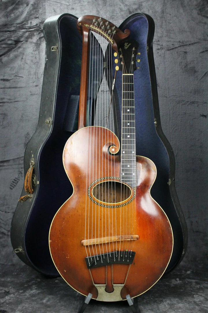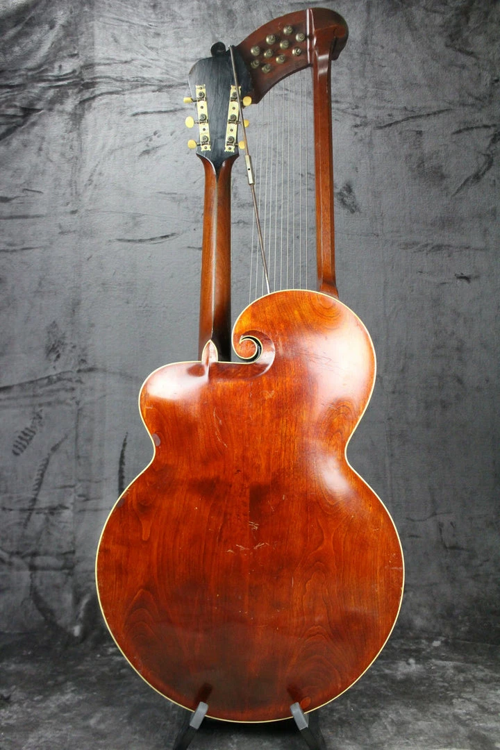 From an original 1907 Gibson catalog: Finest quality, carefully graduated, select spruce top (sounding board), of regular, straight-grain, beautiful finish; finest selected, thoroughly air seasoned maple rim and back, dark mahogany finish, highly polished throughout; hand carved, ornamented and veneered head piece, top and back; laminated extended head-piece supported by octagonal arm extending beneath sounding board to the rim at the end of body, which is the only construction that gives the proper strength to resist the immense tension of the ten sub-basses. To this construction we point with pride, for all the other makes of harp-guitars have failed in supporting any length of time even six sub-basses. East India mahogany bridge, hand carved and ornamented. The immense leverage on the bridge is overcome by the scrolls in the bridge and by the Gibson nickeled extension bridge stay. Ivory-celluloid binding on outer upper edge of rim, so that the inlaying does not affect vibrations; ebony, ivory-celluloid bound artist extension fingerboard, with twenty oval narrow frets; pearl position dots on fingerboard and upper side of neck, thus enabling the performer to catch a position quickly; oblong ivory-celluloid bound sound hole, inlaid with fancy colored woods and celluloid-ivory border; finest quality machine head; bone nut; inlaid bridge pins; extreme length, 46 ½ inches; extreme width, 21 inches; extreme depth 5 ¼ inches; length from nut to bridge 25 ¾ inches, length from nut to bridge on sub-basses, 34 inches. The strings are tuned so as to enable the performer to get an open bass for any chord desired; therefore, the treble only is necessary to finger. Grace and ease of execution are possible, even above the twelfth fret, as body is made low and oval where it joins the neck on the first-string side. Every tone in the treble is responded to in sympathetic vibration by its octave in the basses, which with our construction, gives a power and volume of tone unsurpassed. In staccato and pianissimo passages the performer plays with a little lower wrist, which brings the sleeve down as a damper or acts like the so-called “soft pedal” on the piano. Modulating is as easily performed as on the harp or piano. By actual test with a $1,500 harp, it was proved that this instrument would sustain tone fifteen seconds longer than said harp. The ordinary six string guitar is much more difficult of execution, particularly in flat keys, and is more limited in compass and possibilities. We unhesitatingly recommend the Gibson sixteen-string harp-guitar as the greatest instrument of its kind ever produced.
