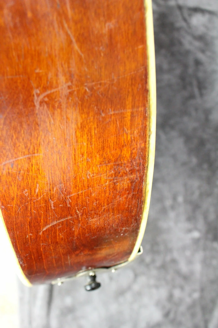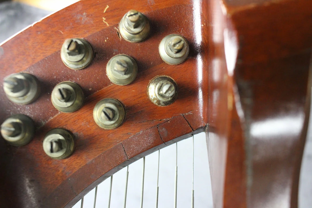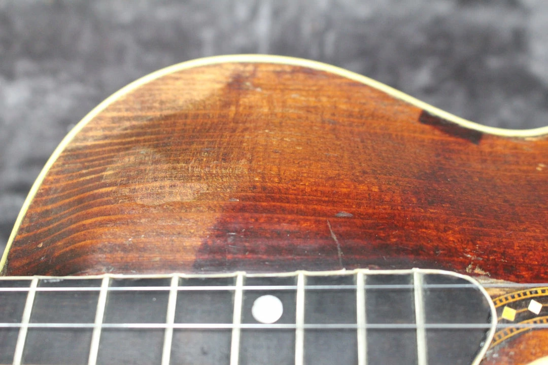 Cosmetics: This instrument has wear that is consistent with a guitar from the early 1900’s. This harp is structurally sound and playable but could use some repair in the long term. There is a crack in the sub-bass headstock. The crack is between the low string and the second low string. There are several cracks in the binding on the six-string part of the instrument. There is a stamp inside the body noting repair work done by a shop in 1931. You can see glue along the edges of the top of the guitar and on the sub-bass side of the instrument near the scroll carve. It is unclear whether the top was removed, or this glue was simply to fill in small separations. There are small cracks in the binding in a few places. The binding on the treble side of the six-string neck near the highest 6 frets on the bass side has been replaced. There are dents and scratches as well as unworn finish where the pickguard once was. The end pins on the plastic tailpiece have been replaced. Overall, this instrument is still in great shape considering it is over 100 years old. This instrument is sold as-is.