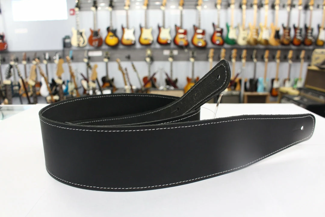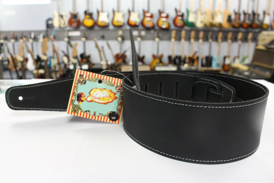 This is a Henry Heller guitar strap. It is black leather with black stitching and the Empire Guitars logo.