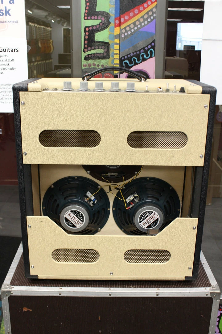 This amp has been tested. It works and sounds great. It has been rehoused in a new cabinet that looks beautiful. It has one American Vintage Warehouse speaker and two Ted Weber Signature speakers. All of the speakers are 10″.