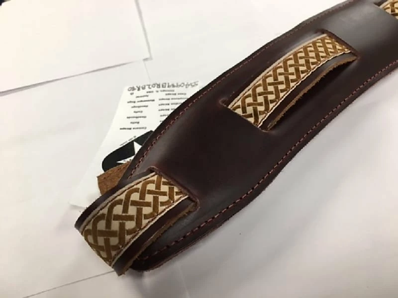 This strap is called the “Celtic Knot” and it has a wonderful pattern with nice dark brown leather with a tint of red & the padding on the back is red……