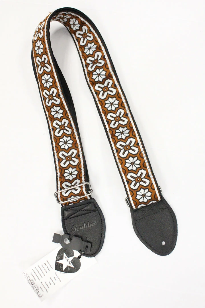 This is a new Souldier Custom Guitar Strap with a Greenwich Brown design and black leather ends