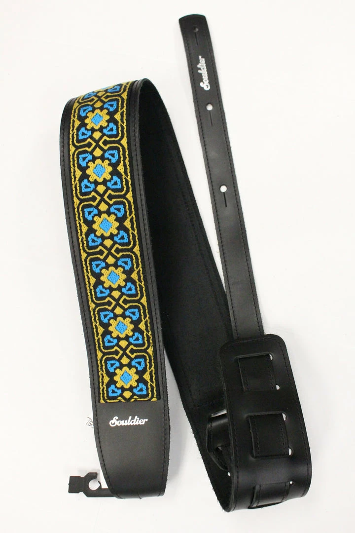 This is a 2.5″ wide leather Souldier Torpedo FillmoreTurqoise guitar strap.